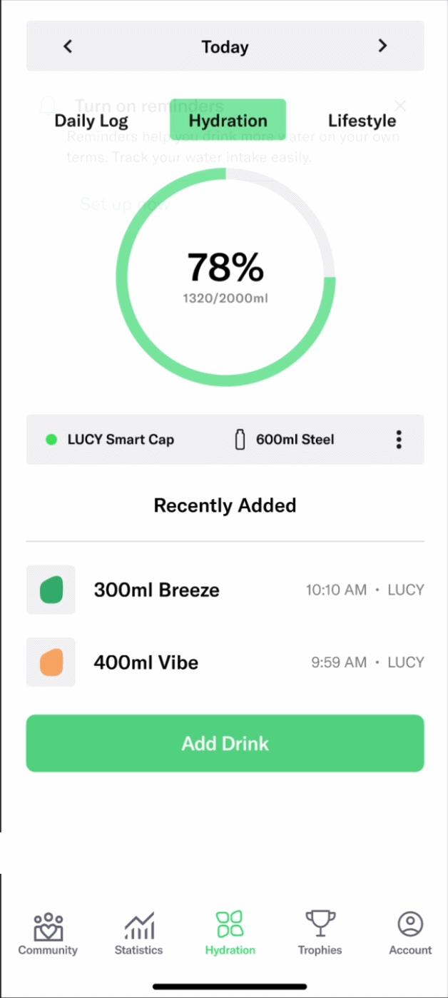 LUCY tracked hydration automatically via Bluetooth. In batch testing, most users assumed it worked straight out of the box with any bottle - it didn't. Calibration was required, and the connection wasn't always reliable. The reflective bottle interior meant tracking accuracy couldn't be guaranteed.